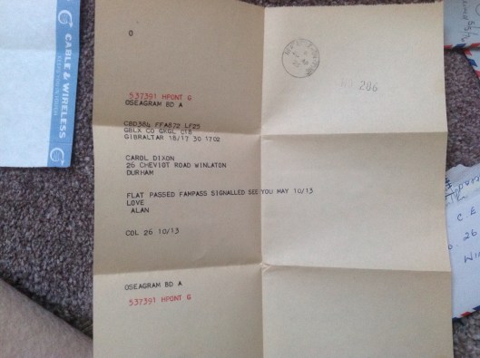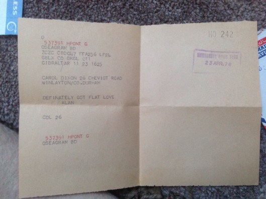 Not long after I had given myself that good talking to a game changer happened. Someone living in Edinburgh House had left Gibraltar and returned to UK which meant that his married quarter was now vacant. As a result another sailor who had been living in a Naval caravan could now move into that mans married quarter. Naturally a third sailor who had been living in a private flat up town was then able to move into the vacant caravan which meant ‘Bingo’ I could have his private let – and because it not long been passed by the Navy the inspection was swift and it passed again!!! Don’t you just love evolution? I immediately applied for 10, Trafalgar House, got it then sent Carol a telegram; it was 23 April 1976, two days after her 21st birthday BOOM!!!